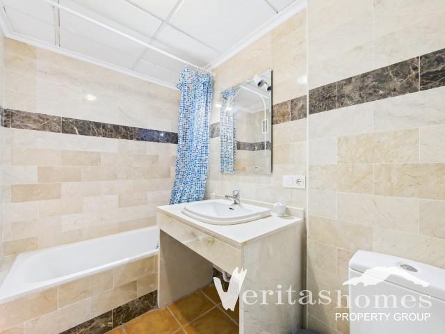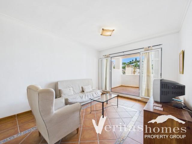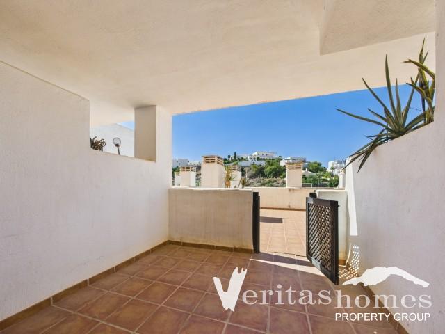 El apartamento cuenta con un amplio salón-comedor con acceso a una terraza cubierta de 11 m² orientada al sur, desde la que se disfruta de vistas abiertas a la Sierra Cabrera. Frente a la terraza hay una gran pasarela comunitaria, lo que aumenta la sensación de espacio y amplitud.