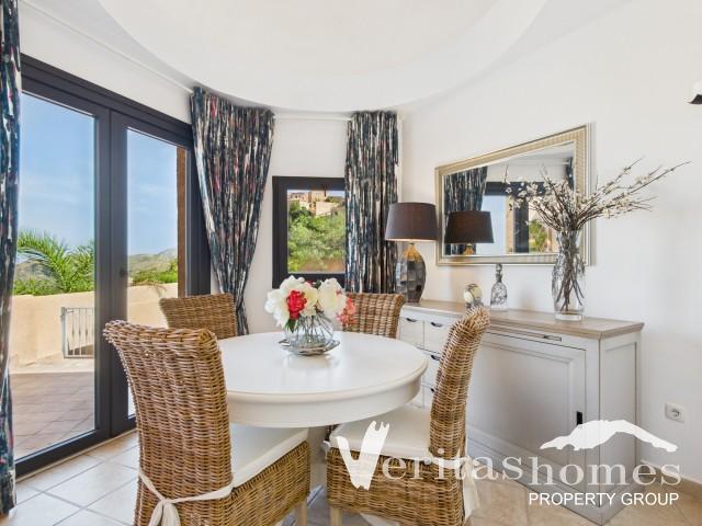 La elegante entrada, con una zona de aparcamiento cubierta para dos vehículos, comunica con un patio privado y la atractiva puerta principal. En el interior, el luminoso vestíbulo da paso a la amplia sala de estar y comedor de planta abierta, con una chimenea y un techo abovedado de estilo morisco. Las grandes puertas acristaladas se abren a la terraza principal, ideal para cenar al aire libre mientras se disfruta de las magníficas vistas.