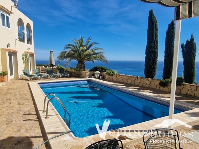 La terraza de la piscina está perfectamente situada para disfrutar de las vistas panorámicas al mar. Hay mucho espacio para tumbonas y comidas al aire libre, incluyendo armarios empotrados y una zona de barbacoa. Un toldo manual proporciona sombra cuando se precisa, y las terrazas superiores cuentan con elegantes arcos de estilo morisco que enmarcan el paisaje. El entorno es muy privado, ideal para disfrutar al aire libre durante todo el año.