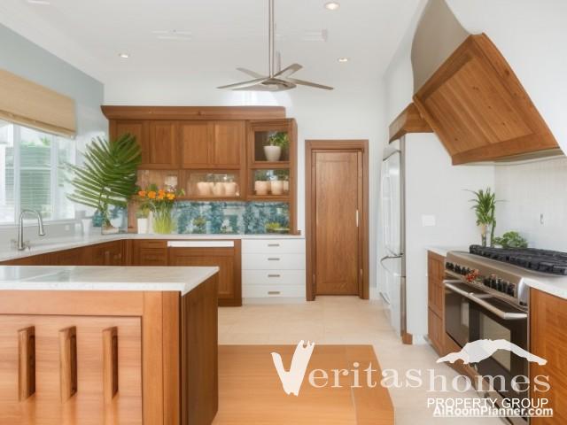 La entrada principal da directamente a un luminoso salón-comedor con ventanas que dan a la terraza de la piscina. La cocina americana de planta abierta incluye armarios de madera, un gran horno con placa de gas, frigorífico-congelador y lavavajillas. Desde la cocina se accede a un lavadero con amplios armarios empotrados, lavadora, zona de planchado y una puerta que da al exterior, a la piscina.
